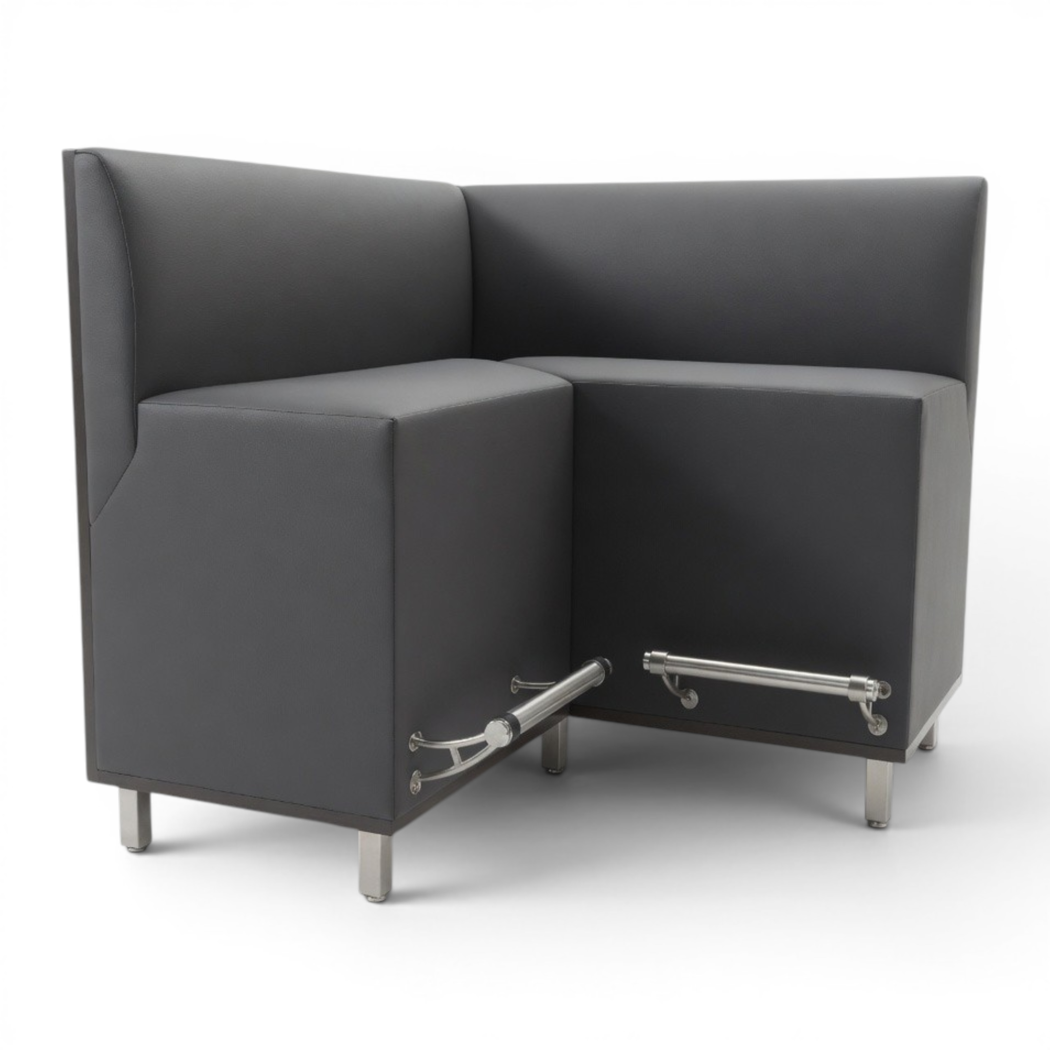 The Canyon L-shaped corner booth, currently installed at Chickasaw Bricktown Ballpark (home of the Oklahoma City Dodgers), features a clean, space-efficient design with a high back, generous seating, and a durable flip-up mechanism. Built with a sturdy frame and equipped with a steel foot rail, it offers excellent comfort and is engineered to withstand high-traffic crowds.