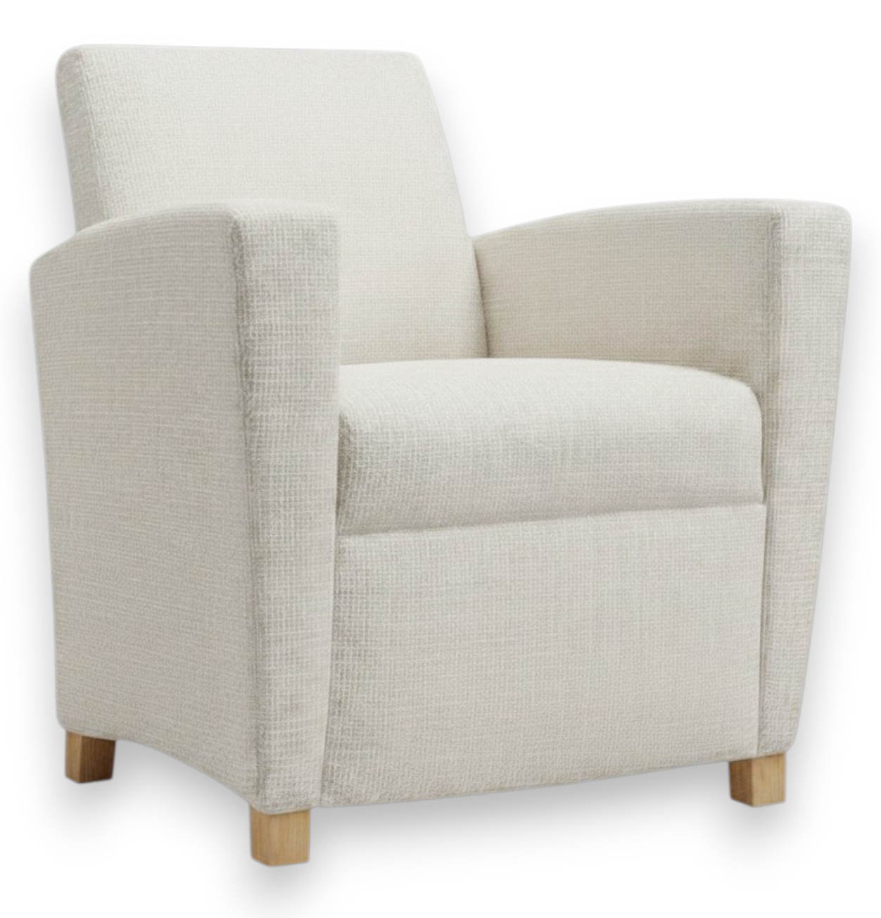The Evans Lounge Chair combines everyday comfort with timeless style, featuring a generously cushioned seat and backrest upholstered in a soft, textured cream woven fabric. Gently curved armrests and a slightly reclined back create a naturally welcoming silhouette, while natural solid wood block legs add a warm, grounded finish. Versatile enough for both residential and commercial spaces, the Evans pairs effortlessly with a wide range of interior styles. Updated by Charles Alan Furniture in 2026.