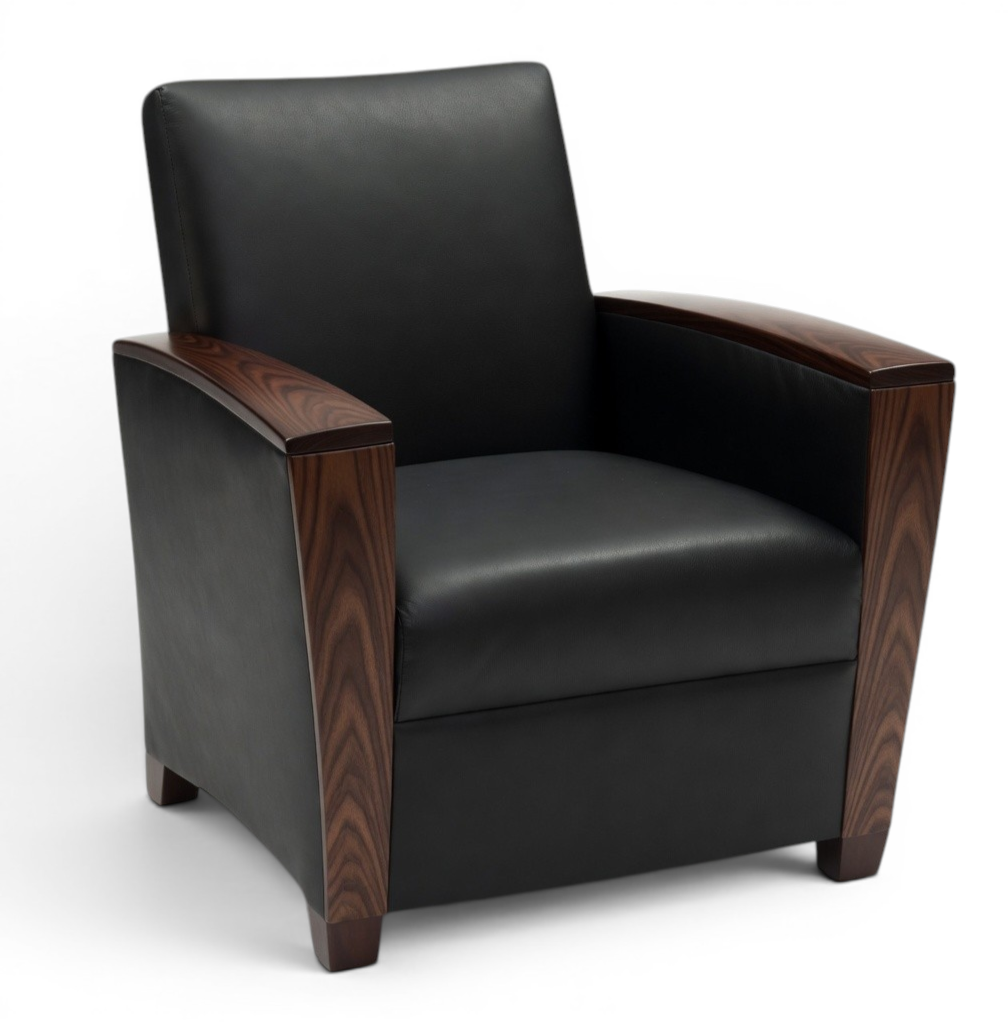 The Evans II is a modern boxy lounge chair with clean lines and generously curved arms. Upholstered in premium matte black leather and finished with rich dark walnut wood arm caps and legs, it offers sophisticated comfort and timeless appeal. Ideal for offices, lounges, hotels, and living spaces.