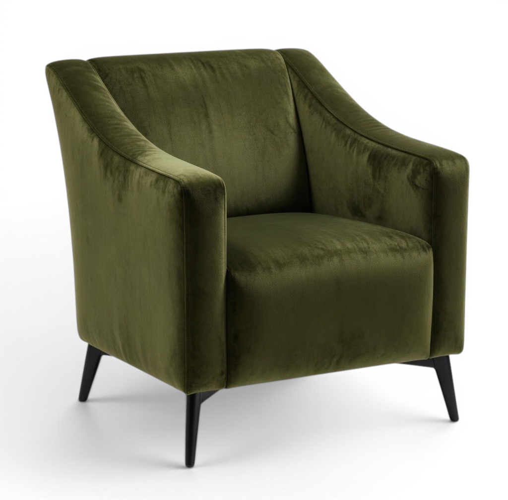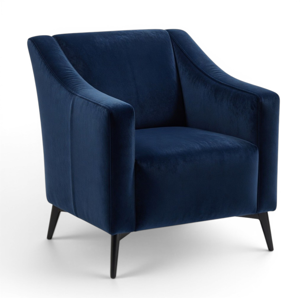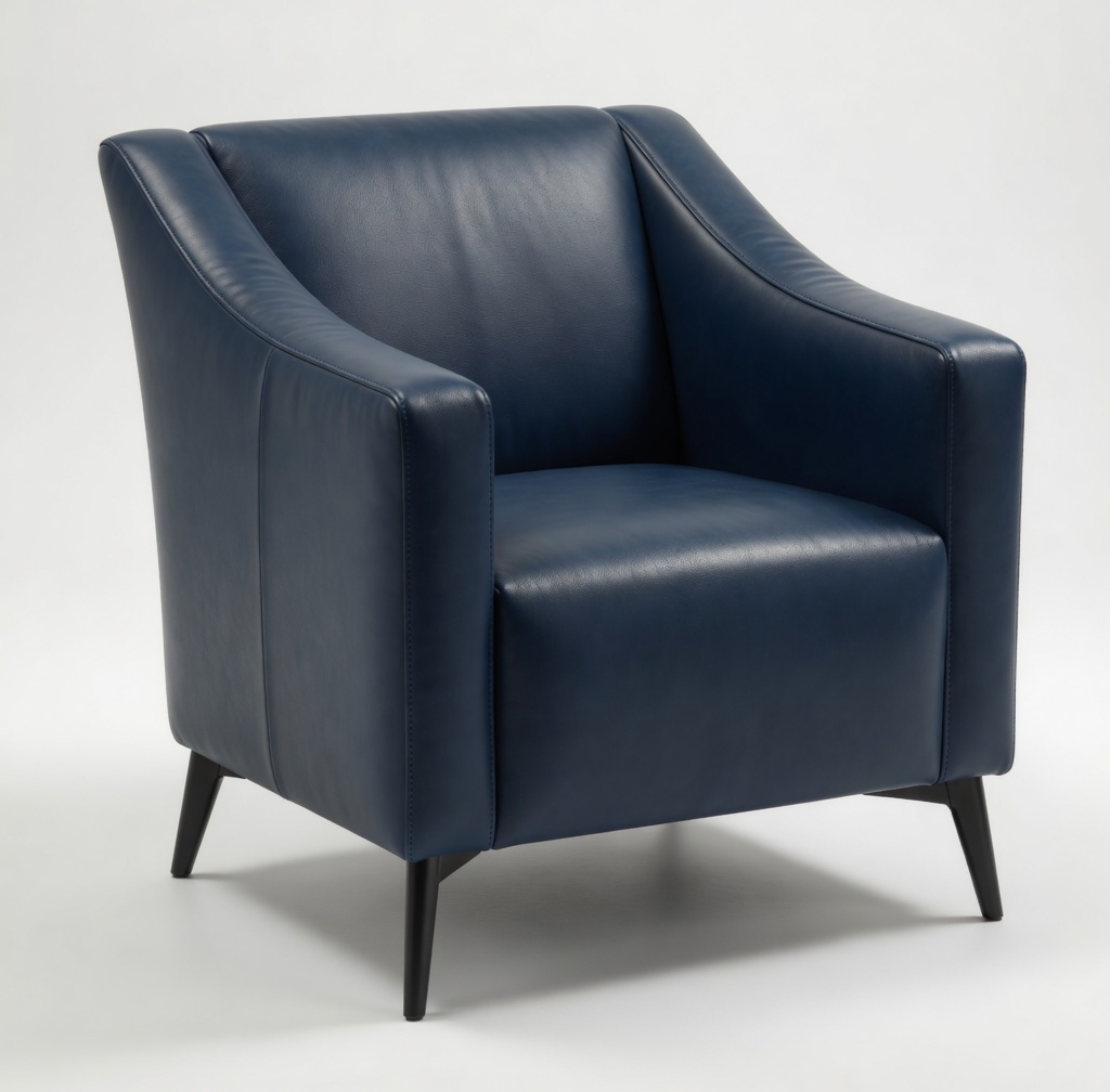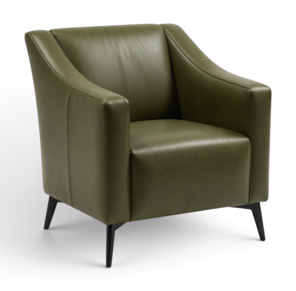 This modern lounge chair features a sculptural curved silhouette with enveloping arms and a generously cushioned seat. Upholstered in rich, supple leather or fabric with sleek black tapered legs, it offers bold style and exceptional comfort for both residential and commercial spaces.