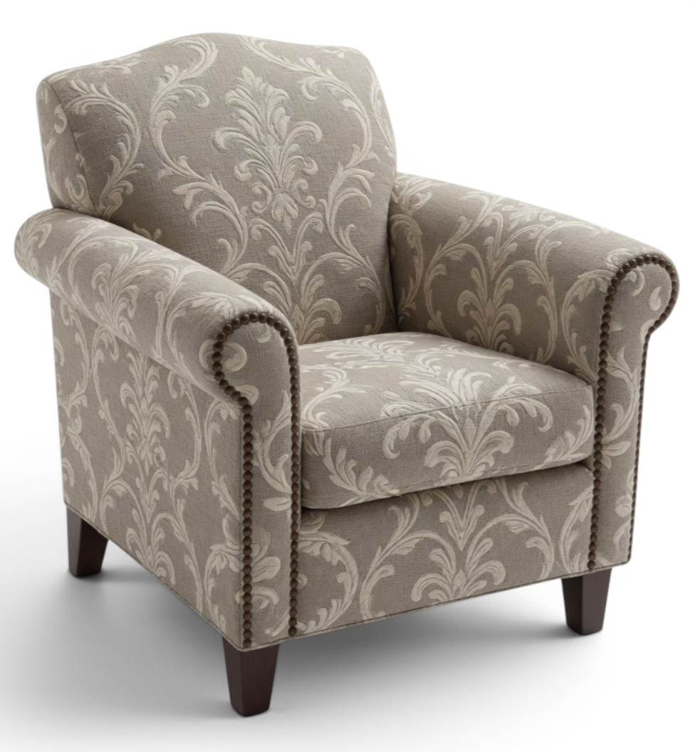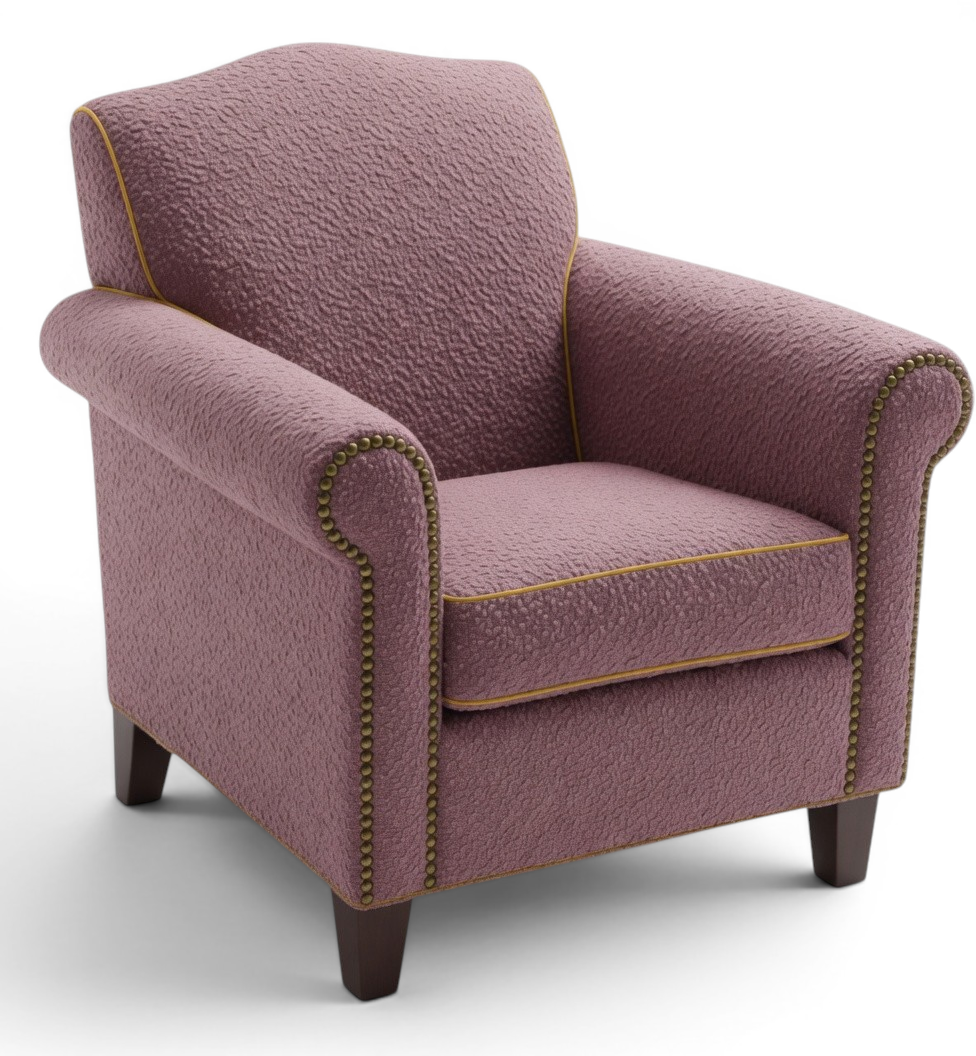 This refined club armchair features classic rolled arms with nailhead trim, a generously proportioned seat, and modern straight legs. Upholstered in soft mauve bouclé with warm yellow piping accents, it offers elegant comfort and timeless style perfect for living rooms, lobbies, or hospitality spaces. More options in the gallery below.