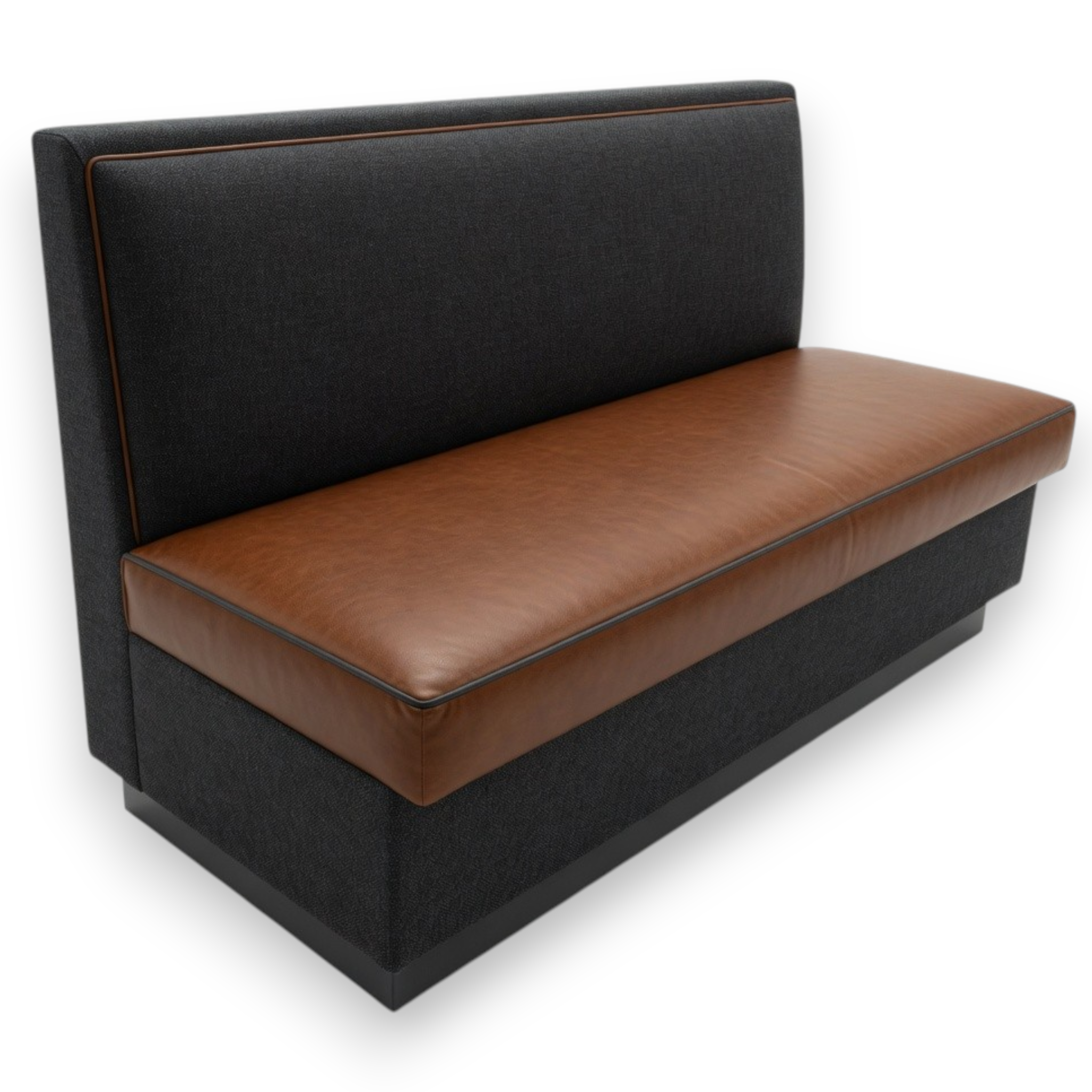 This modern high-back banquette features a clean, architectural design with a tall backrest and generous seating. Upholstered in a sophisticated deep charcoal gray textured performance fabric on the back with rich warm cognac brown performance leather on the seat, highlighted by subtle dark piping for a refined finish.