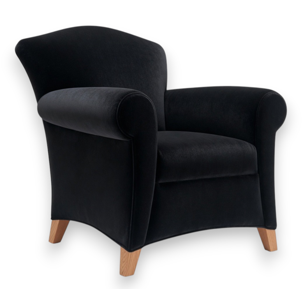 This modern curved armchair features a sculptural silhouette with generously rounded arms and a cozy, enveloping back. Upholstered in rich black velvet with a plush feel and paired with light natural wood legs, it offers sophisticated comfort and contemporary style for living rooms, bedrooms, or lounges.
