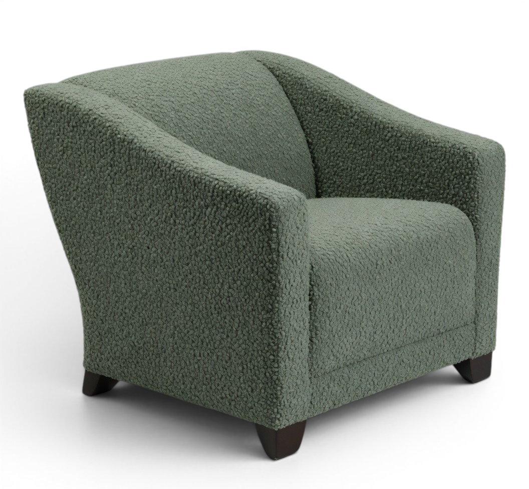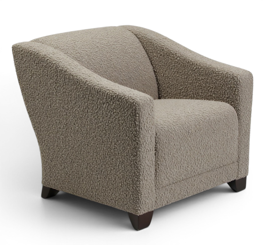 This modern barrel armchair features a sculptural curved silhouette with enveloping rounded arms and a cozy, continuous back. Upholstered in luxurious bouclé with rich texture and paired with dark wood legs, it delivers sophisticated comfort and contemporary style perfect for living rooms, lounges, or reading nooks.