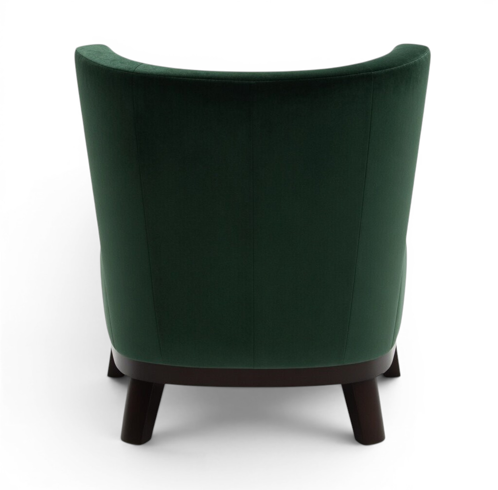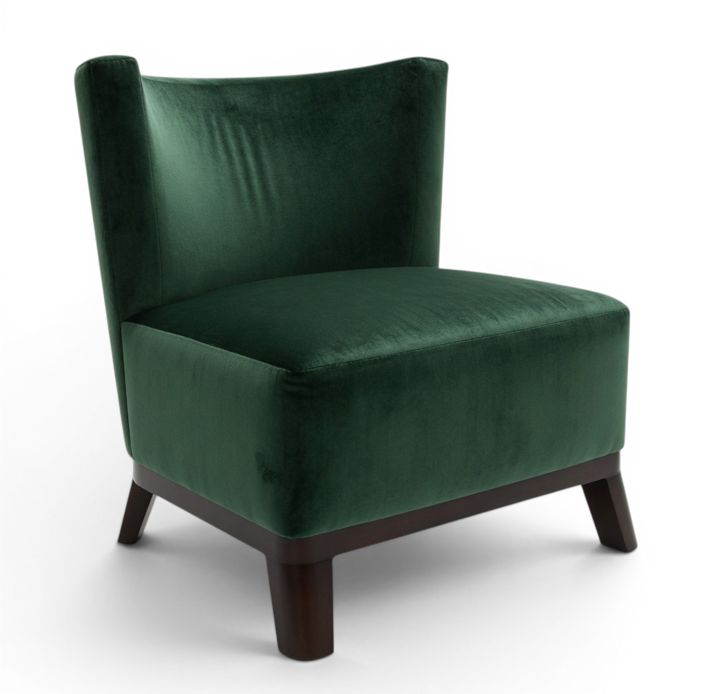 This modern high-back armchair features a sleek, curved silhouette with clean lines and supportive track arms. Upholstered in rich forest green velvet with a luxurious plush feel and complemented by dark wood legs, it delivers sophisticated comfort and contemporary elegance perfect for living rooms, offices, or hospitality spaces.