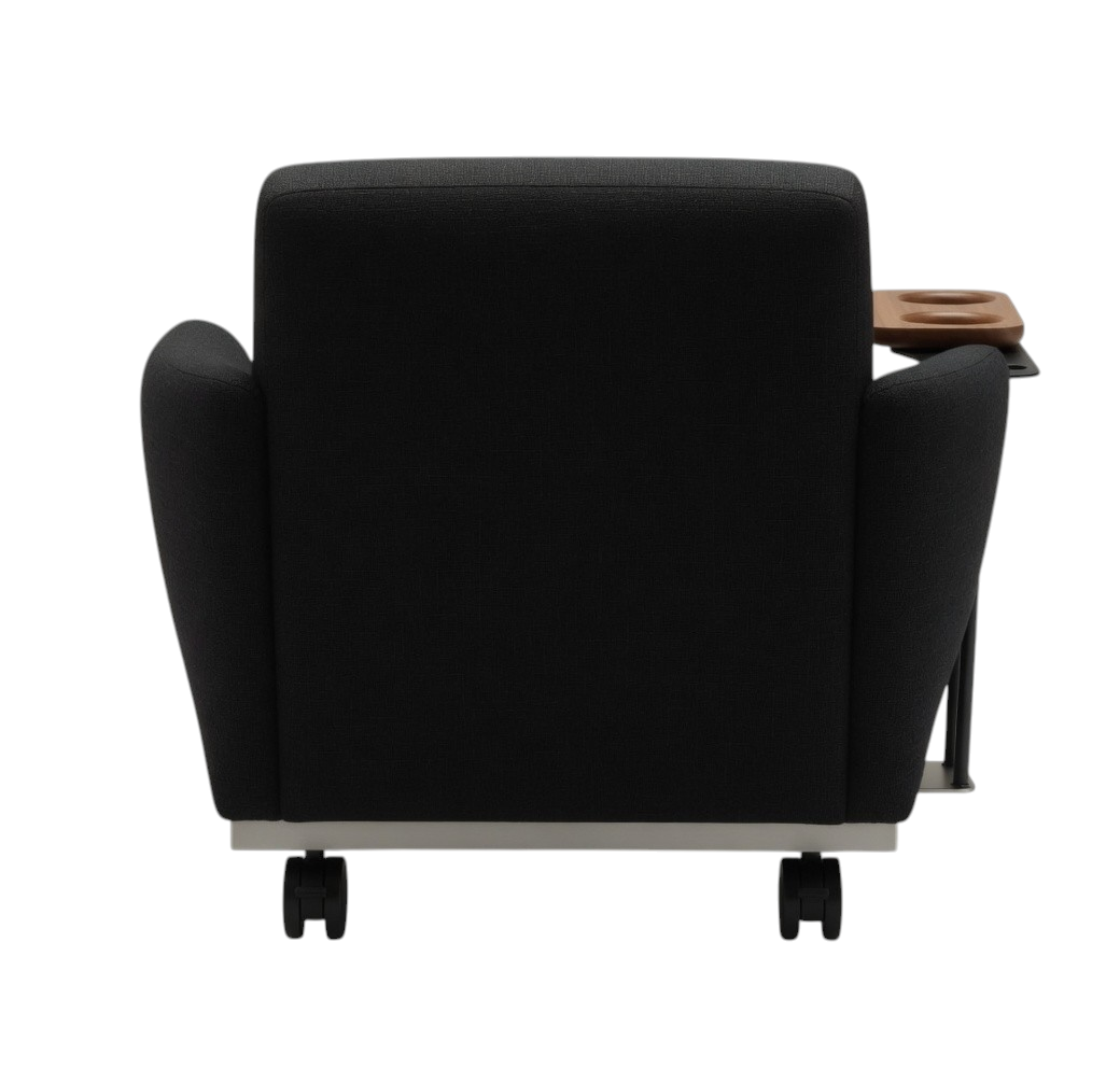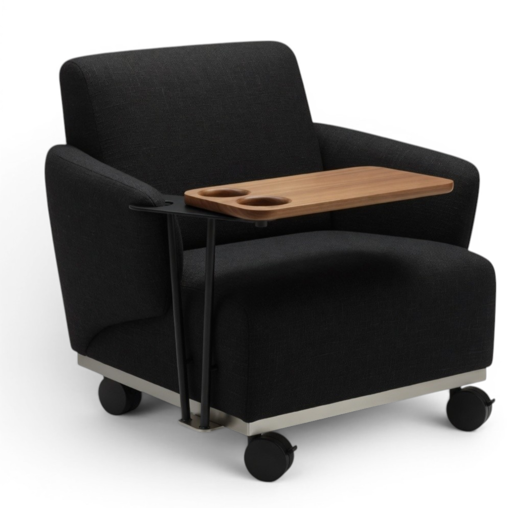 This modern black linen armchair features a clean, contemporary silhouette with plush seating and a convenient flip-down wooden tablet with integrated cup holders. Upholstered in a sophisticated textured black linen fabric and equipped with a durable wheeled base, it offers versatile functionality and comfort, making it ideal for offices, waiting rooms, lounges, or healthcare environments.