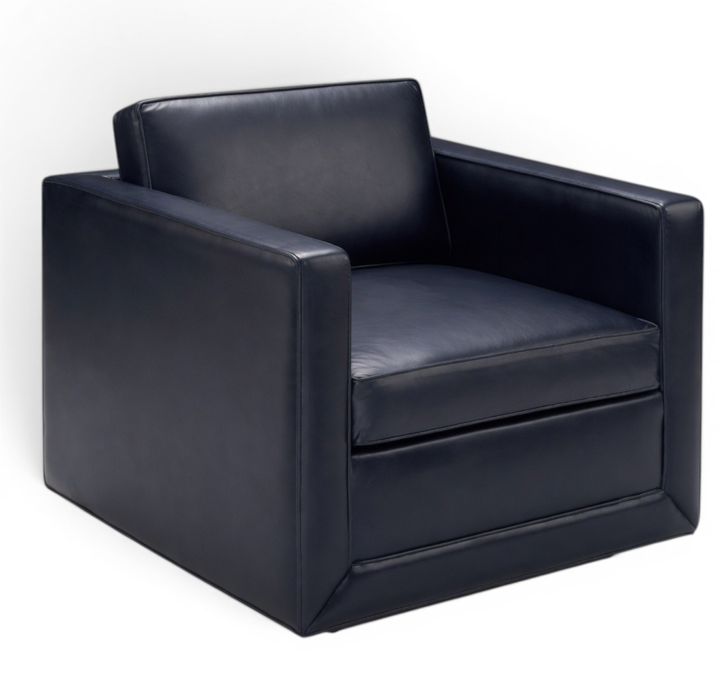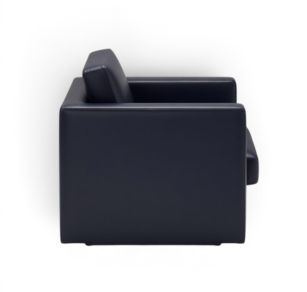 This modern boxy armchair features a bold, architectural silhouette with clean geometric lines, a generous seat, and substantial proportions. Upholstered in rich deep navy leather with a smooth matte finish and tailored detailing, it offers durable luxury and timeless sophistication. Perfect for living rooms, executive offices, hotel lobbies, or contemporary commercial spaces.